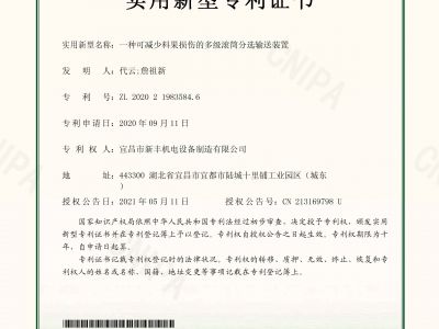 實(shí)用新型專利證書(shū)《一種可減少料果損傷的多級(jí)滾筒分選輸送裝置》