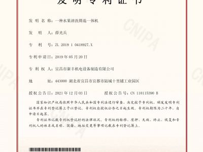 實(shí)用新型專利證書《一種環(huán)形加工的水果分選機(jī)》