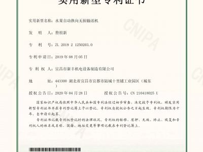 實(shí)用新型專利證書《水果自動(dòng)換向無損輸送機(jī)》